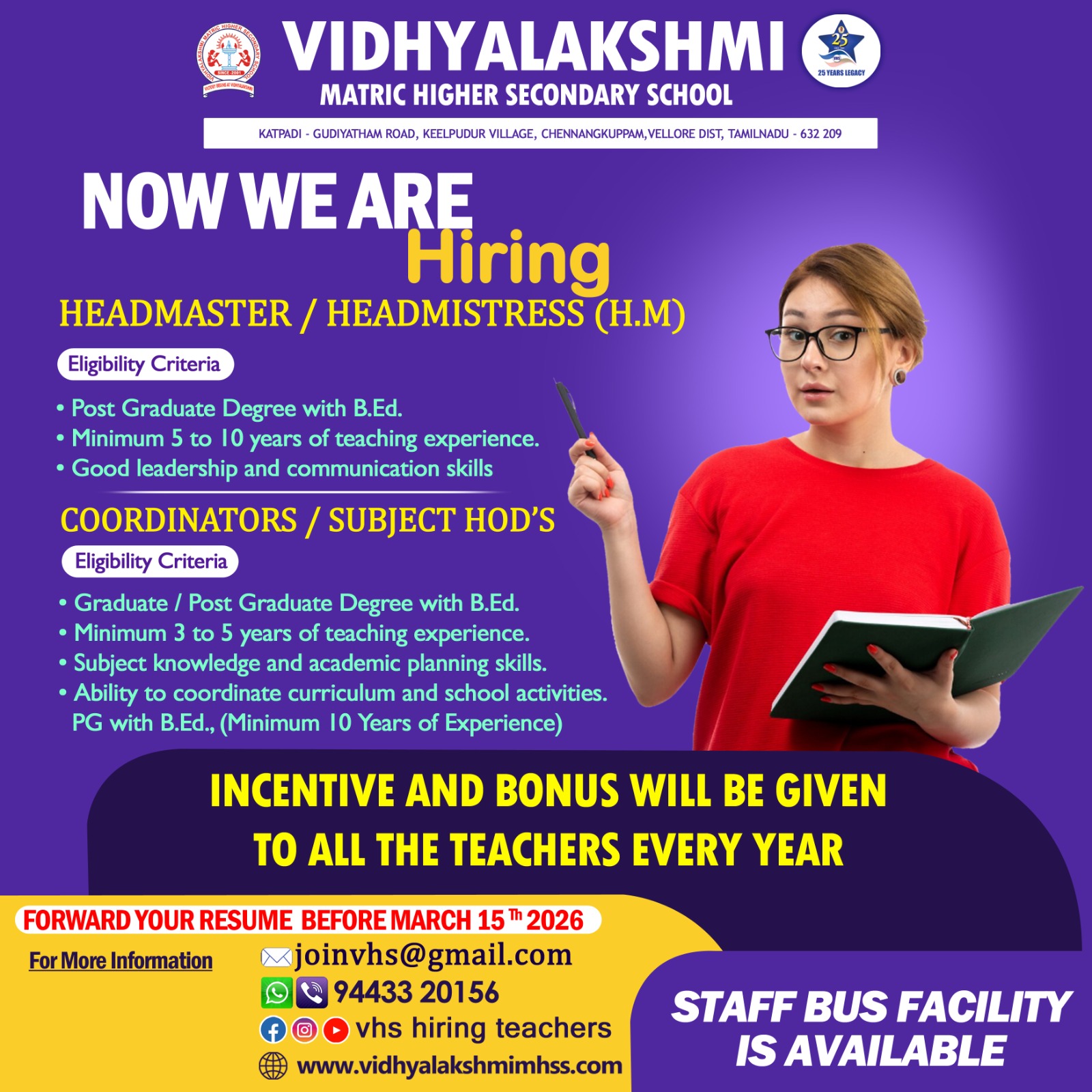 ABOUT THE SCHOOL Located on Katpadi-Gudiyatham Road in the district of Vellore, Vidhyalakshmi Matric. Higher Secondary School stands amidst 25 acres of picturesque greenery, offering a serene environment that fosters the joy of learning. With an abundance of trees and the delightful chatter of birds, the natural surroundings provide an ideal backdrop for academic pursuits. The school prides itself on offering both Matriculation and CBSE curricula up to class 12, ensuring a diverse and comprehensive educational experience for all students.